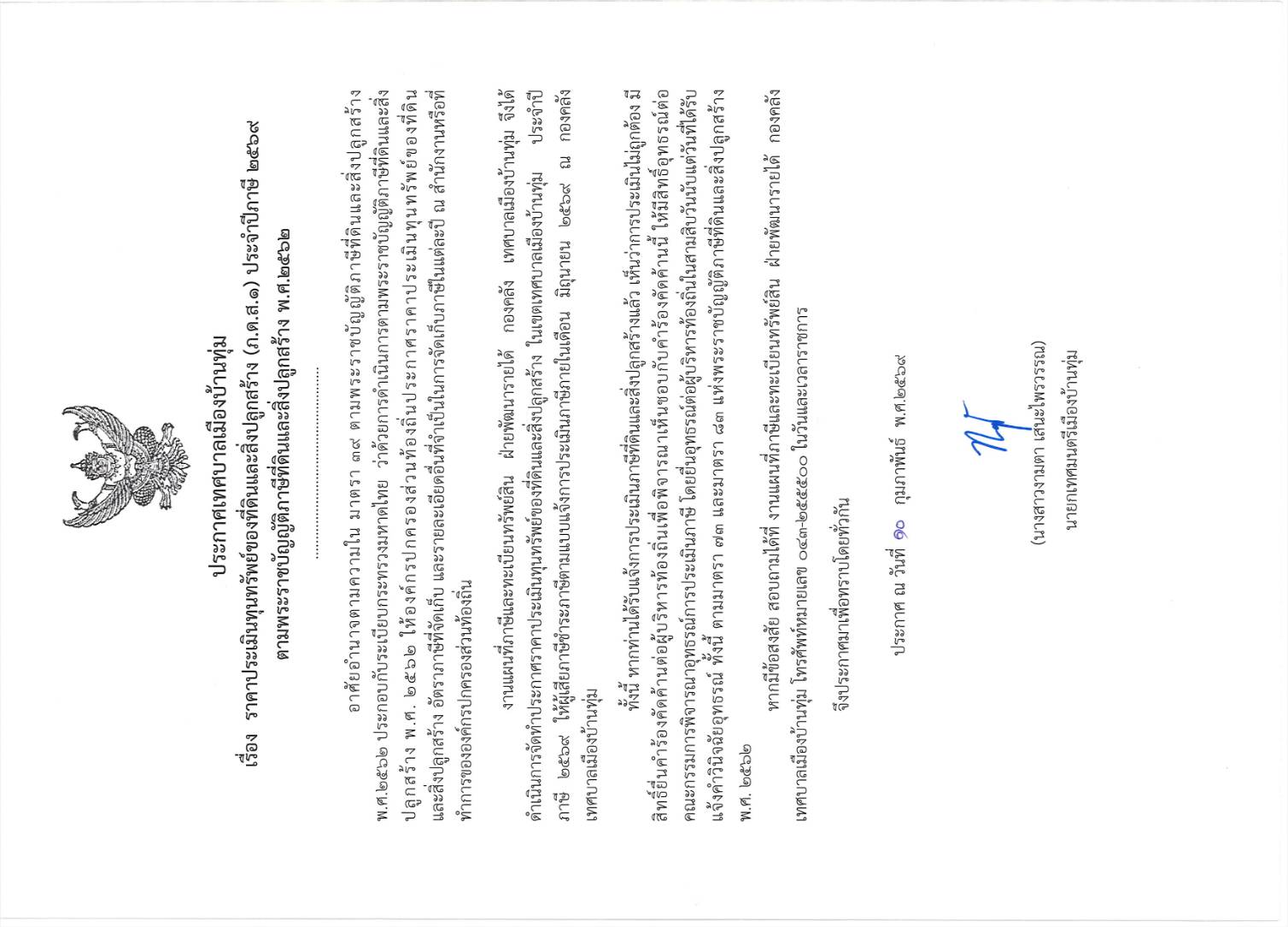 เรื่อง ราคาประเมินทุนทรัพย์ของที่ดินและสิ่งปลูกสร้าง (ภ.ด.ส.๑) ประจำปีภาษี ๒๕๖๙ ตามพระราชบัญญัติภาษีที่ดินและสิ่งปลูกสร้าง พ.ศ.๒๕๖๒