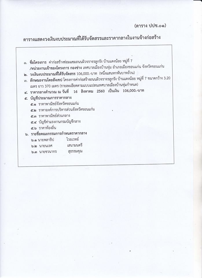 ตารางแสดงวงเงินงบประมาณที่ได้รับจัดสรรและราคากลางในงานจ้างก่อสร้างในโครงการ ซ่อมแซมถนนลูกรัง บ้านแดงน้อยหมู่ 7